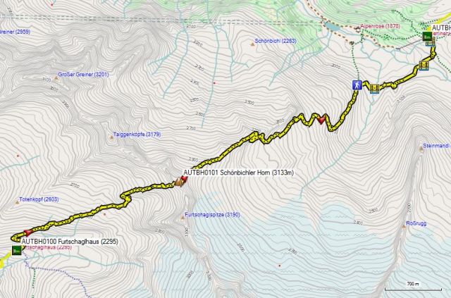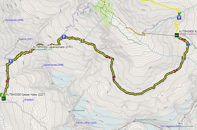 Eenmaal je je zowat boven het Friesenberhaus bevindt, vind je een splitsing (AUTBHD112) met het pad naar de Friesenbergscharte (2904m) en een pad dat in de plaatselijke traditie zeer steil afdaalt en vervolgens een dalkom met stenen passeert tot je het normale toegangspad tot het Friesenberghaus bereikt. In omgekeerde richting is het pad aangenamer dan in de hier beschreven richting.