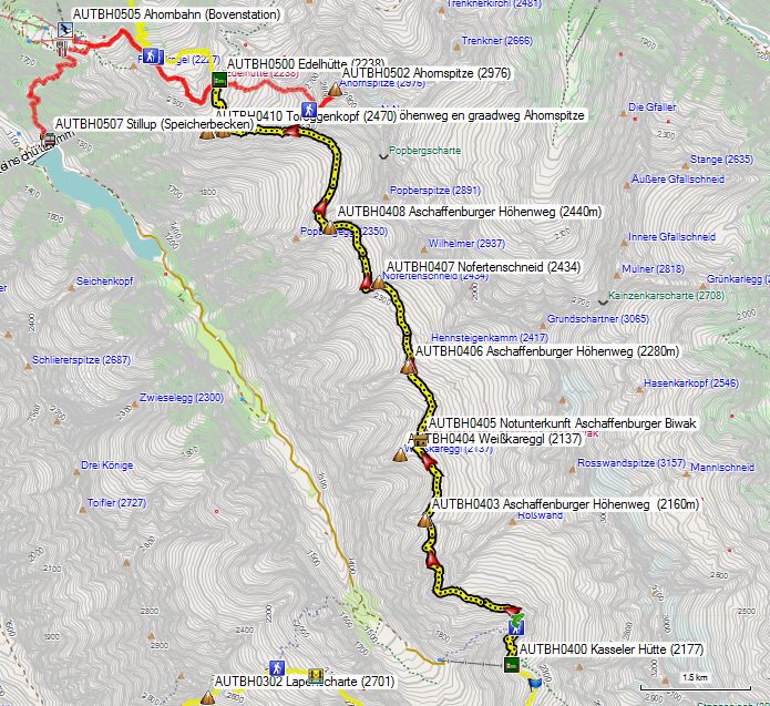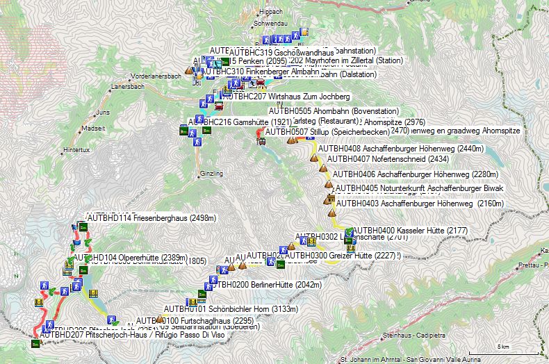 Voor het trajekt Mayrhofen, Edelhütte, Kasslerhütte, zou ik een lichte voorkeur geven aan de wijzerzin mits je zeer goed ingelopen bent, gezien je op het traject Edelhütte Kasslerhutte, beter bekend als de Aschaffenburger Höhenweg of Siebenschneidensteig dan het zwaarste gedeelte eerst te verwerken krijgt.