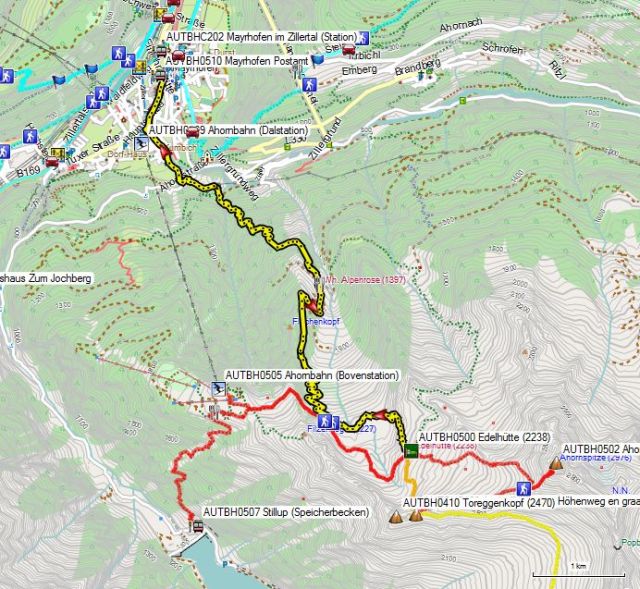 Een beetje voorbij de hut komt het pad uit op een jeepweg (AUTBHC111). Vanaf hier wordt de afdaling aangevat, soms langs de jeepweg, soms langs een pad dat de bochten afsnijdt. Uiteindelijk kom je aan het gasthuis Steinerkogel (1269m – AUTBHC117). Vanaf hier heb je een mooi uitzicht op Mayrhofen. Vervolgens daal je weer af via een pad (nr. 5) naar Mayrhofen. Bij GPS AUTBHC119 passeer je de Brandberger Kapelle en een kruisweg en vervolgens bereik je bij GPS AUTBHC120 het begin van de bewoonde wereld van Mayrhofen. Door het stadje ga je terug richting camping (AUTBHC000).