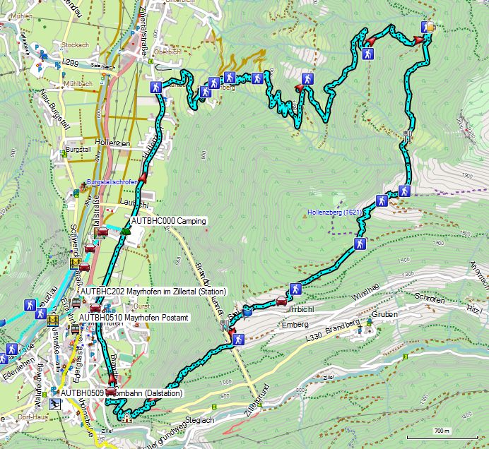 Je vertrekt vanaf de camping (AUTBHC000) en loopt naar links richting Mayrhofen tot het eerste asfaltwegje naar links. Dit volg je tot het einde en tot aan de bosrand, waar je het pad naar links volgt (Hollenz Bergweg). Deze weg staat niet aangegeven op digitale kaarten. Je dwarst het asfalt en blijft deze weg volgen tot je op wat asfalt komt. De aanduidingen zijn hier niet zo duidelijk.