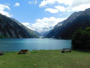 Van aan de Olpererhütte heb je een mooi uitzicht op het stuwmeer en de omliggende bergen.