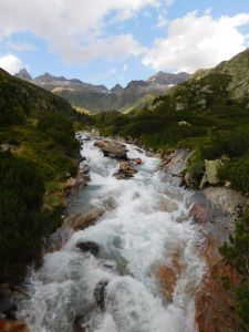 Na een rustpauze vat je de afdaling aan. Eerst ga je terug tot aan de grens en vanaf hier kan je zowel de jeepweg nemen als het pad dat afdaalt naar het stuwmeer. In de kom, komen de twee terug samen. Waar de meanders van de rivier terug samenkomen om zich vervolgens in een geul te storten, heb je de mogelijkheid om rechtstreeks via het pad af te dalen (AUTBHD209) , of klim je terug een stukje via de jeepweg tot aan de Lavitzalm (AUTBHD210) op 2098m. Hier vind je de gebruikelijke producten. Het is hier gezelliger dan in de Italiaanse hut, die wat steriel overkomt, vooral door de zelfbedieningstoog. Wees vooral niet verwonderd dat je hier veel lui met een fiets zult zien sleuren. Blijkbaar maakt dit deel uit van een grotendeels verharde populaire mountainbikeroute.