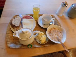 Veel calorieën, niet zo verfijnd. Het ontbijt was ook nogal afgemeten qua hoeveelheid brood. Alles wordt hier vanaf de lift aangevoerd per paard. De hoeveelheid elektrische energie is beperkt (zonnepanelen). Er is wel warm water aan de lavabo’s op het ‘Lager’verdiep.