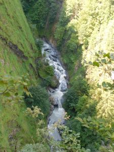 Je vervolgt in dezelfde richting, tot je aan een kruispunt(AUTBHC229) komt, met rechts van jou een brug. Hier dwars je de brug (AUTBHC228) en ga je in dezelfde richting verder, stroomopwaarts langs de rivier tot je uitkomt in een bocht van de weg (AUTBHC223). Je dwarst de rijbaan en gaat rechtdoor, eerst min of meer vlak, maar al snel gaat het steil omhoog. Op een bepaald ogenblik dwars je een klein bruggetje (AUTBHC221) en klim je verder door een weide tot aan een bosrand.