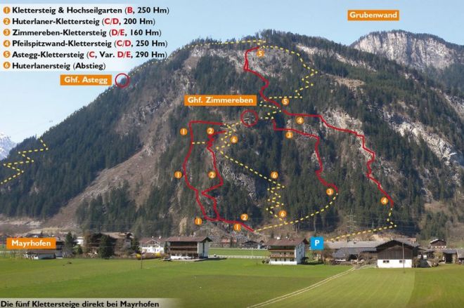 Vanuit het centrum van Mayrhofen gezien ligt de gemakkelijkste, die ook voor kinderen toegankelijk is, het dichtst naar Mayrhofen en de moeilijkste het verst. Die voor kinderen heeft ook elementen van een touwparcours, die moeilijker zijn dan de Via Ferrata zelf en die kunnen vermeden worden, gezien ze zich naast de Via Ferrata zelf bevinden.