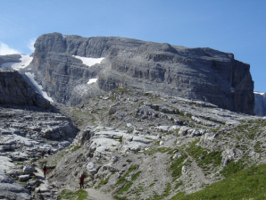 Dan gaat het verder over sneeuw en steenslagvelden tot aan de afslag (GPS 020 – 2741m) van de Sentiero Bruno Dallagiacoma. Opnieuw een goede plaats om wat te rusten.