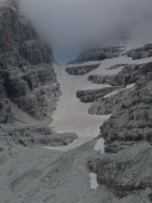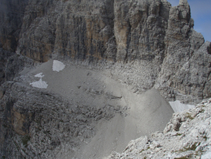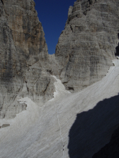 Bij GPS 031 neem je maar beter een kleine rust- en maaltijdpauze, want hier zijn de mooie banden voorbij en komen er heel veel ongezekerde stukken. Uiteindelijk kom je echt op de Bocca aan de voet van de Guglia (GPS 032). Vanaf hier daal je in totaal 150m tot de Bocchetta del Campanile Basso. Veel stukken zijn ongezekerd. Je daalt af door zeer steil “wandelgebied” , op een ondergrond van fijne steenslag afgewisseld met een aantal gezekerd stukken, soms op onlogische plaatsen. De vermoeidheid begint te spelen en dus moet je bij de pinken blijven om geen uitschuivers te maken. Sneeuw heb ik hier niet echt gezien, maar het was dan ook een bewuste keuze om zo laat mogelijk in het seizoen te komen, om de sneeuw maximaal de tijd te geven om weg te smelten.