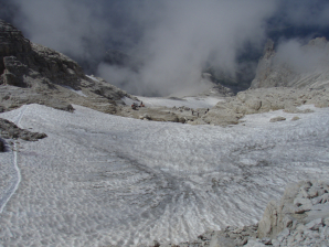 In de kloof zie je een ladder en een wegwijzer die zowat 4 meter onder het huidige sneeuwniveau reikt. Met wat bergtouw heeft men een horizontale traverse uitgebouwd, zodat je tot op de sneeuw kan. De steuntjes voor handen en voeten zijn wat aan de kleine kant voor bergschoenen en aangezien het touw niet erg strak zit, is de afklim wat heikel. Eenmaal op de sneeuw dien je onmiddellijk de stokken uit te halen, want het eerste deel van het spoor loopt vlak langs de randkloof. Onder de oorspronkelijke route vind je een reeks wegwijzers. Wat verder vind je een rode vaan met de aanduiding van het pad nummer 358 naar de Rifugio Agostini. Op weg naar de 12 Apostel hut loop je evenwijdig langs de rotswand en de rand van de gletsjer. Langs het spoor staan bordjes met de aanduiding “XII”, die soms niet in de juiste richting aangeven, gezien de spijlen kunnen draaien in de sneeuw. Aanvankelijk loopt het pad vrij horizontaal, maar onder de Bocca d’Ambienz gaat het steil omhoog. Op foto’s in de klettersteiggids ligt er veel minder sneeuw op deze helling. Aan het einde van het sneeuwveld vind je de staalkabel (GPS 039), maar hij is niet goed zichtbaar, gezien hij afgewend zit van het sneeuwveld.