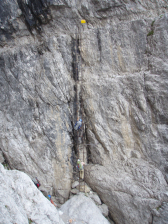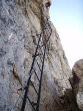 Je overbrugt een hoogteverschil van 160m in een opeenvolging van bijna uitsluitend ladders, waarbij de laatste ruim 300 sporten telt (waarvan 2 gebroken). Wie tijd heeft om te kijken, vindt op de rotsen mooie plantjes. Ondanks dat we zeer vroeg vertrokken waren, kwamen we aan de voet van de eerste reeks ladders reeds dezelfde gids met drie gasten tegen, die we ook aan de lange ladder op de Sentiero Sosat waren tegengekomen. Vooral bij de vrouwelijke deelneemster, kon je de angst in de ogen aflezen, waardoor ze abnormaal traag bewoog en de zaak blokkeerde voor ons, ondanks dat wij een niet gezekerde standplaats hadden ingenomen in afwachting van haar passage. Net voor de laatste lange ladder kwamen we twee vrouwelijke klimsters tegen, waarbij er één in slaagde om haar fototoestel te laten vallen en ze terug diende af te dalen. Onderaan de ladders vonden we nog een groep met gids, waarbij ik de gids met pek en veren zou willen instrijken omwille van zijn handelswijze. Vooreerst waren sommige deelnemers van zijn groep voorzien van een harnas met één enkel touw zonder valbreking en een musketon zonder schroef of twist-lock. Bovendien bond hij de deelnemers onderling in, maar hield hij het inbindtouw zelf gewoon los in de hand!!!!