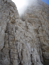 Je keert terug in de richting van waaruit je gisteren kwam en loopt tot aan GPS 021. Hier ga je naar rechts en bij de volgende splitsing opnieuw rechts. Vervolgens maak je een bocht in wijzerzin rond de kom van het dal om aan de overzijde terug te keren in de richting van de Rifugio Tuckett. Het pad begint dan een ruime bocht naar links door een gebied met veel blokken. Hierdoor ontstaat een zigzag parcours. We liepen dit traject in de wolken, waardoor we niet veel van het landschap konden genieten. Bij GPS 025 wordt er ingebonden en worden de stokken weggestoken. Hier begint er een serie van ladders, zonder veel technische moeilijkheden. Aan de ladder van 15m was er een kleine file, omdat er voor ons een groep met een gids zat. Dit betreffen meestal onervaren mensen, waardoor alles wat langer duurt, maar van grote opstoppingen hebben we geen last gehad ondanks het mooie weer. In de kloof aan de voet van de ladder van 15m ligt er een steen geklemd in de kloof, die een soort brug vormt naar de voet van de ladder. Daarna komt er een lang horizontaal stuk. Verder passeer je een zone, waar de overspanning zo laag is dat je op handen en voeten moet kruipen.