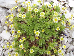 Aan de voet van de Guglia vind je direct naast het pad ook een grote diversiteit van planten, die tussen het grind groeien. Vervolgens kom je op het zadel van de Busa del Castelaz (GPS 059), waar je een gedenkplaat vindt voor de persoon naar wie dit pad is genoemd. Dit is een goede plaats om wat te rusten en in te binden. Vervolgens volgen er twee zones met horizontale kabelzekeringen in een galerij, waarbij vooral de passages door de droge rivierbeddingen wat heikel zijn. Na de galerijen volgt er na een tijdje een ongezekerde afklimzone, waar ik toch eventjes mijn stokken heb verkleind om aan de voet ervan ze weer te verlengen. Dan volgt namelijk een lang traject waarbij het pad verloopt door een helling van fijn grind en een aantal kleine, maar relatief steile sneeuwvelden, die je horizontaal dient te traverseren. Uiteindelijk kom je aan de voet van de Bocca del Tuckett, waar je een splitsing (GPS 060) vindt met het pad naar het dal. Na een rustpauze, vat je de klim aan naar de Bocca. Je begint met een sneeuwveld. Ook hier diende ik als eerste passant van de dag te sporen omdat er gisteren afdalers waren die het niet nodig vonden om uit te stappen uit het spoor om hun skikunstjes te vertonen. Wat volgt is een pad dat lastig is om te klimmen en dus zeer heikel om af te dalen. Net onder de Bocca vind je een kabel tegen de wand, maar die hangt vrij hoog en dus moet je ofwel hoog tegen de wand traverseren, ofwel ongezekerd in de geul blijven. Ik vermoed dat de kabel vooral voorzien is, als hier nog sneeuw ligt, hoog op het pad.