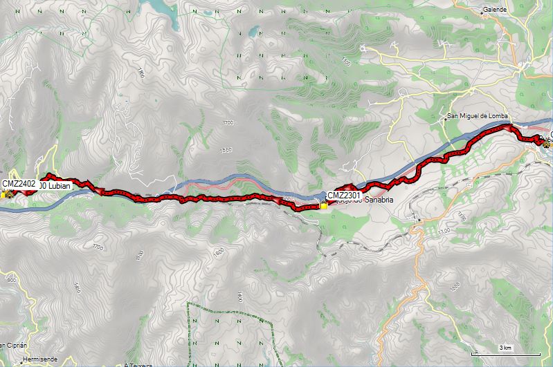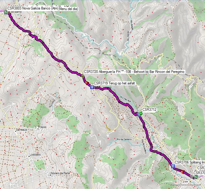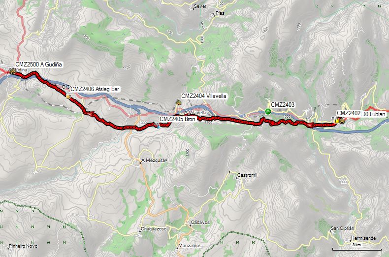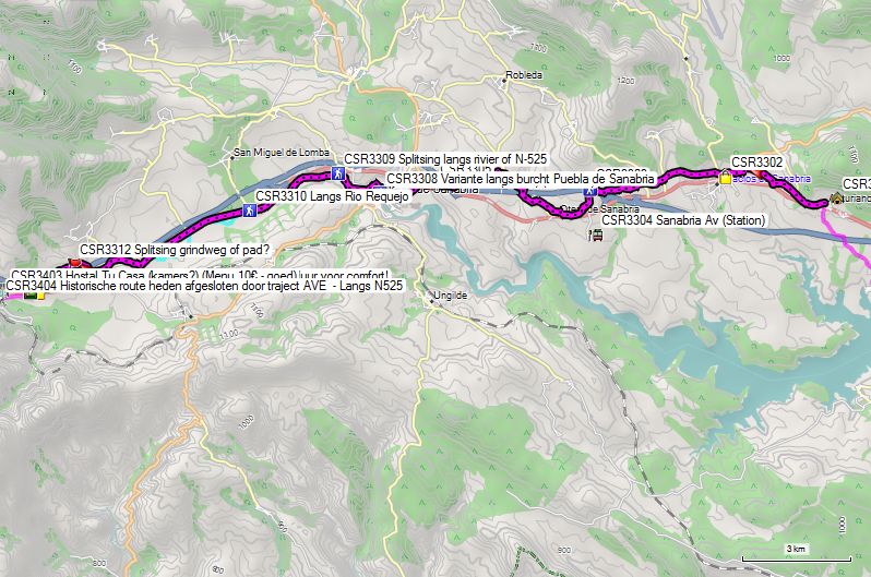 De CM verlaat de N525 aan het reeds genoemde restaurant Maria José (CSR2408) en steekt aldaar een bocht af in de N525. In Prado keer je terug naar de N525 om hem aan het einde opnieuw te verlaten. Je keert terug tot vlak aan de N525 om hem dan opnieuw te verlaten en af te dalen naar de historische brug van A Ponte Taboada. Na de brug klim je terug naar het niveau van de N525. De CM is hier dus langer, mooier, maar lastiger!