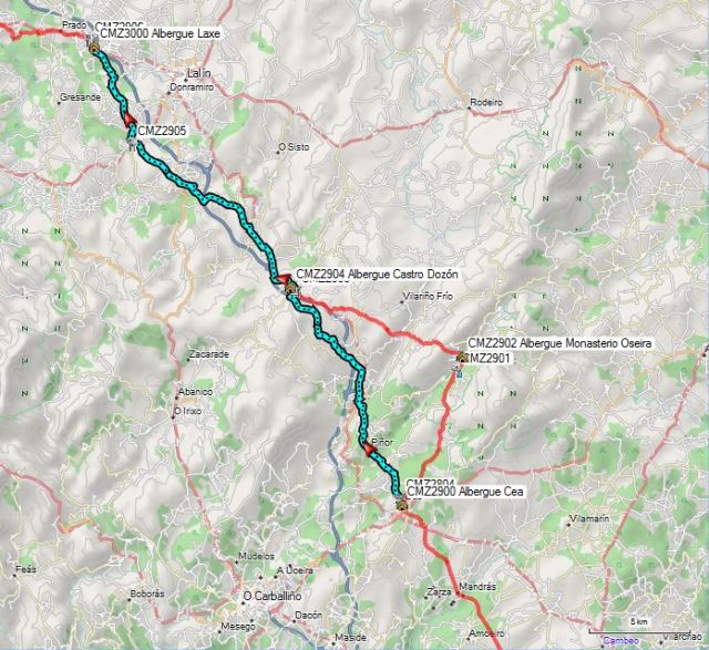 Aan het kruispunt met de pijl naar de albergue, volg je de gele pijlen naar rechts. Je bereikt het dorpsplein en dwarst dit. In de winkelstraat van Cea, vind je de splitsing tussen beide varianten. Je gaat hier naar links door de winkelstraat. In een bocht ga je naar rechts. Daar vind je de weg naar het Monasterio de Oseira en ook een ‘S’. Je volgt deze weg tot Cotelas en dan ga je naar links verder via Pinor & Arenteiro.