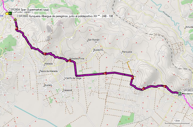 Je verlaat de albergue naar rechts en vervolgt je weg langs de CM. Je loopt evenwijdig aan de N525. Langzaam zie je de dichtheid van de behuizing toenemen. Vlak voor Susana ga je op een weg met een bushalte naar links. Je steekt de N525 over en verdwijnt in een achterafstraatje achter de huizen van Susana.