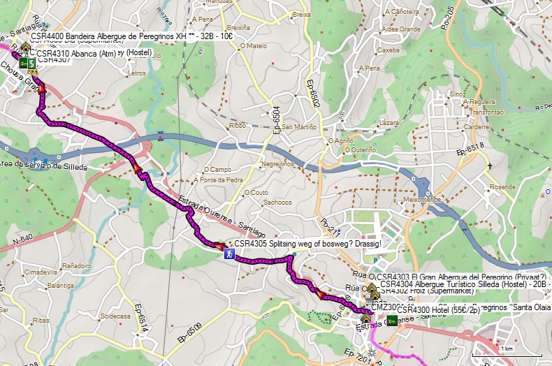 Na deze grote afdaling kom je terug op de N525. Na 100m verlaat je deze alweer aan een kapel aan een parking voor een heel mooi stukje CM tot Silleda. Onderweg raak je nog eventjes aan het industriegebied van Silleda om dit onmiddellijk weer te verlaten voor een bosweg. In het centrum van Silleda moet je aan een parkje naar rechts via de winkelstraat tot de N525, die je naar links volgt.