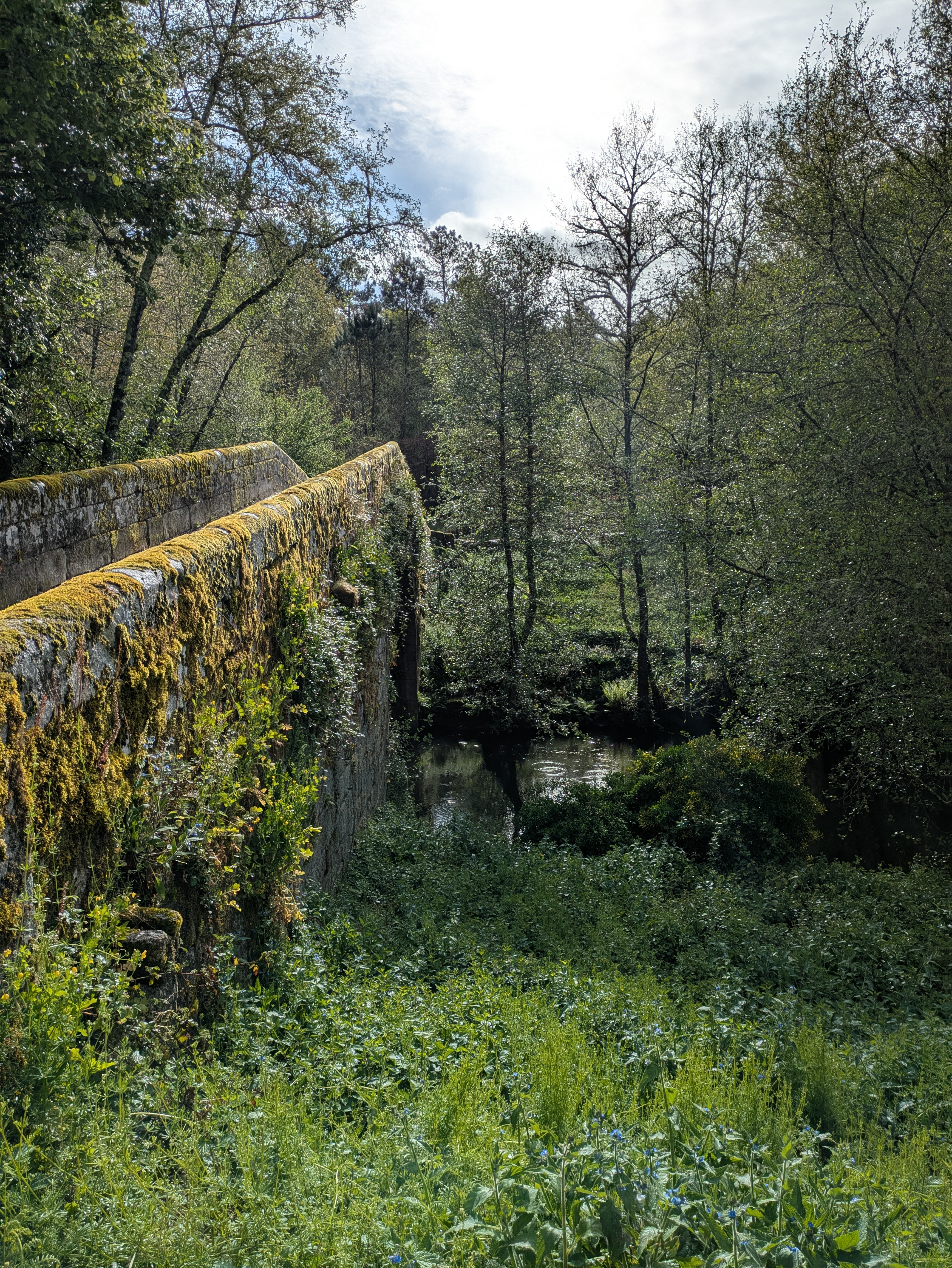 Na 750m sla je weer af naar links richting N525. Vlak voor de N525 sla je af naar rechts. De weg verwijdert zich langzaam van de N525. Vanaf hier volgt een zeer mooi stuk door bossen met veel eucalyptusbomen. Je passeert het dorpje Castro, vanwaar je zicht (CRS4404) hebt op zowel de oude als de nieuwe spoorwegbrug over de rivier Ulla. Vanaf hier daal je probleemloos af tot Puente Ulla. De afdaling naar Puente Ulla is zeer steil. Je gaat over de Romeinse brug, die wat tegenvalt door zijn ligging naast de nieuwe.
