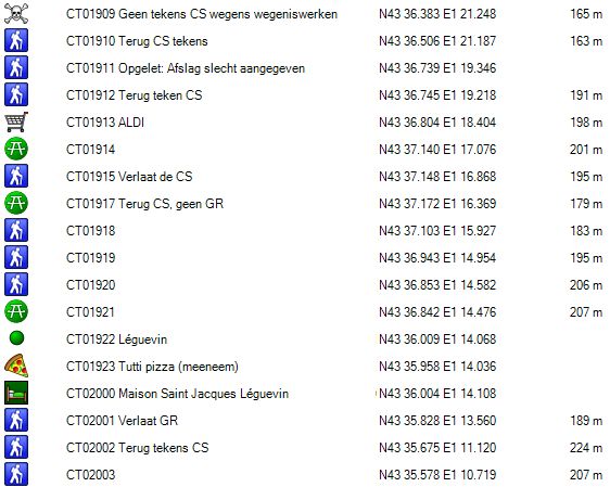 - Frankrijk behoorlijk goed, maar afhankelijk van de rijkdom van het departement en de goodwill van de vrijwilliger, die de GR-markeringen onderhoudt. Weinig feitelijke problemen, behalve een aantal plaatselijke hiaten (wijngaarden in Bouches du Rhone & Gard). Enkel in de centra van grotere steden durven de GR-markeringen in het echte centrum onvoldoende zijn. De beschrijving, maar vooral een eigen GPS tracklog bieden dan uitsluitsel.