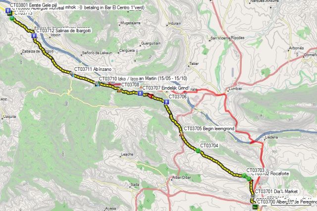 Je vervolgt in zuidwestelijke richting via hoofdzakelijk verharde wegen, waarbij je de gehuchten Abínzano (CT03711) en Salinas de Ibargoiti (CT03712) passeert. Je dwarst de Rio Elorz alvorens Salinas de Ibargoiti binnen te gaan. Vergeet het pad langs de rivier, want dat is volledig versperd door omgevallen bomen.