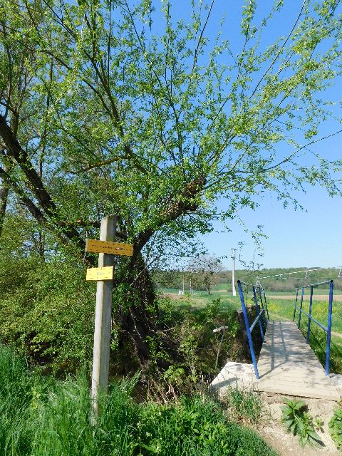 Op de verharde weg sla je rechts af en loop je het dorp opnieuw uit. 400m verder ter hoogte van een luidruchtige hond kan je links afslaan om via een pad de bocht af te steken. 80m verder doe je hetzelfde. Je loopt nu evenwijdig aan de Cv-684, die je later dwarst.