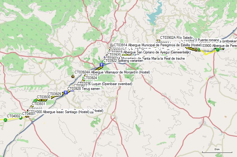Wat verder vind je een parkje met banken voor het Monasterio de Santa María la Real de Irache (CT03921A). 500m verder vind je een splitsing (CT03922) tussen 2 varianten: één langs CT03924A Albergue Villamayor de Monjardín (privaat) voor wie aldaar wil overnachten en een iets kortere langs Luquin. Gezien ik van dit gedeelte geen reisgids mee had, koos ik voor de kortste.