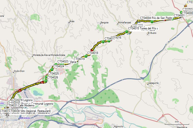 Vanaf deze wisselaar volg je het historisch traject via een autovrije weg parallel aan de N-111. Je komt uit op de Lr-132 Carretera de Mendavia, evenwijdig aan de Rio Ebro en dit ter hoogte van het crematorium. Je volg de Rio Ebro tot aan de brug, alwaar je omhoog gaat richting het informatiecentrum (CT04024). Je dwarst de brug. En gaat schuin recht de Calle de Ruavieja in. Na 150m vind je de gemeentelijke herberg (CT04100). Vlak daarvoor vind je nog de herberg Santiago Apostol.