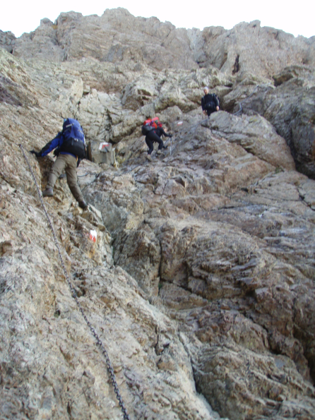 First comes a part of horizontal traverse on sloping rock plate and then you’re at the beginning of the chain. Sometimes the chain is installed in a horizontal section, sometimes completely vertical. In that case you take the chain between your legs and pull yourself up along it, while placing your feet flat on the rock plates. The chain ends with a short ladder and then you go further down to a highly visible wooden pole (ever been a signpost?).