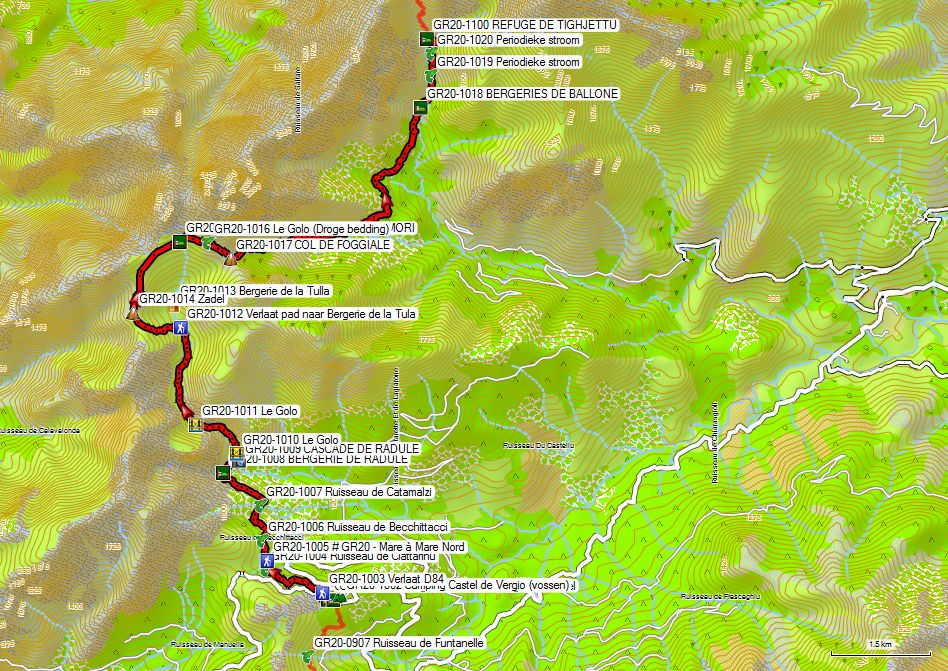 You follow the asphalt uphill, make a turn to the right, around the hotel and in the next turn to the left, you leave the asphalt straight ahead (GR20-1003). There are signs. Then follows a path of the type that we already know from just after Vizzavona: very erratic, slaloming between trees and rocks, and so you should look carefully for the waymarks. On a fairly open spot, you’ll find the signs of the junction with the Mare à Mare Nord (GR20-1005). And then the path continues with more of the same. Just before the Bergerie d’E ‘Radule (GR20-1008) you have a few places with a beautiful view on the waterfall (GR20-1009). Don’t expect anything spectacular, but it’s already better than the Cascade des Anglais.