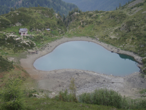 Aan het einde van het weidegebied kom je aan de bosrand. Het pad gaat nog licht omhoog en vervolgens daal je af tot de Rifugio Campogrosso (45’).