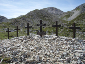 Rechts gaat het richting Rifugio Lancia, rechtdoor wordt aangeduid als Zenevri. Verderop vind je geschilderde aanduidingen “E5 var.” Het eerste deel van het pad is nog net aanvaardbaar gemarkeerd. Vanaf de afslag terug richting Sorgente, die op zich ook al slecht aangeduid is, is het pad enkel nog aangeduid met steenhoopjes. In een omgeving van resten van militaire structuren is het pad zeer moeilijk te volgen tot aan de Sette Croci. Je vindt hier letterlijk zeven kruisbeelden van graven van oorlogsslachtoffers. Vanaf Sette Croci is er weer een duidelijke weg tot aan de Selletta del Groviglia (aanduiding ter plaatse, op kaart vermoedelijk Selletta del Piccolo Roite).