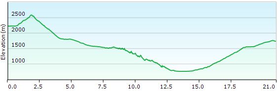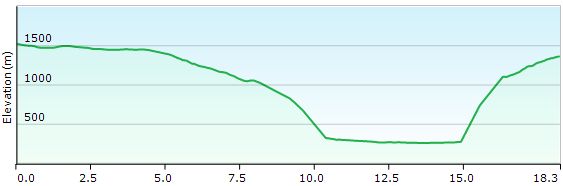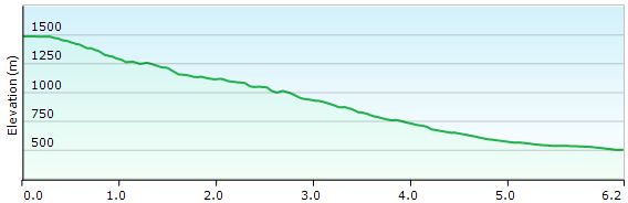 Aan de hut loop je langs de dalzijde. Hier vind je een teken E5 aan de voet van een vlaggenmast. Het eerste deel van het pad is duidelijk en daalt af links van een grote drinkvijver voor vee, bijna een klein meertje links van een boerderij. In het horizontale deel is het pad vrij vaag. Op het einde van deze kom, verandert het karakter van het pad volledig. Het pad heeft een volledige rotsbodem. Het is licht technisch met een occasionele kabelzekering, die overbodig is bij droog weer, maar eventueel noodzakelijk wordt bij nat weer. Lager in het dal krijgt het pad een bosbodem. De afdaling eindigt aan een brug over de rivier. Vanaf hier is het pad volledig verhard. Het komt uit op de asfaltweg (1u20’). Je volgt deze bergaf. Net voorbij het ecomuseum, vind je opnieuw een pad dat afdaalt naar de rivierbodem. Je dwarst de rivier via een dam over een grotendeels drooggelegde rivier. Aan de overzijde vind je een grote parking met BBQ-haarden en picknicktafels. Het stinkt hier naar achtergelaten vleesafval.