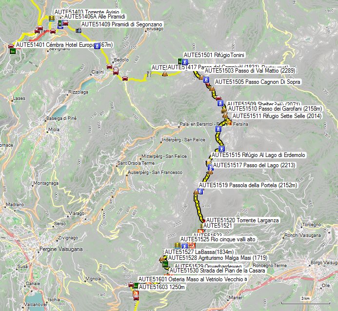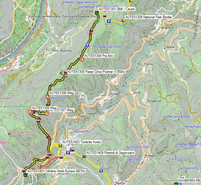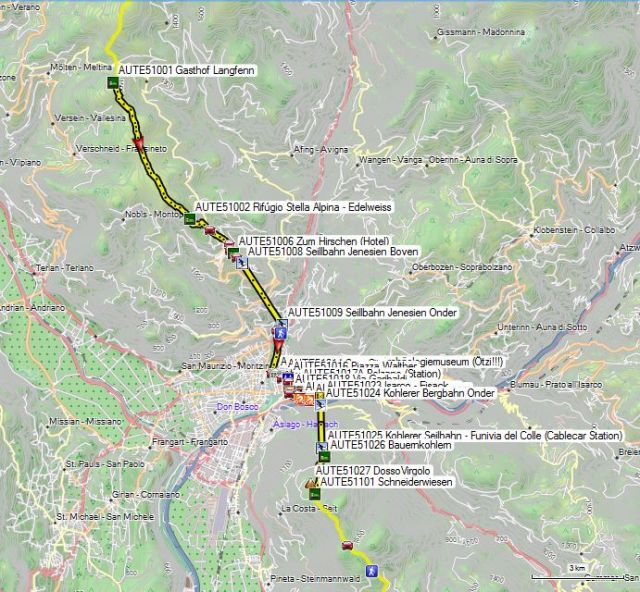 Uiteindelijk heb ik nabij Bozen twee maal de kabelbaan gebruikt om zo 1000m stijgen en dalen uit te sparen. Voor samen 6€ kan je geen gewrichtsletsel riskeren. Daarenboven kwam er hierdoor tijd vrij voor een bezoekje aan Ötzi. Bovendien is de omgeving rond Bozen niet echt optimaal. Ook tussen Albergo Monte Rovere en Carbonare nam ik de bus.