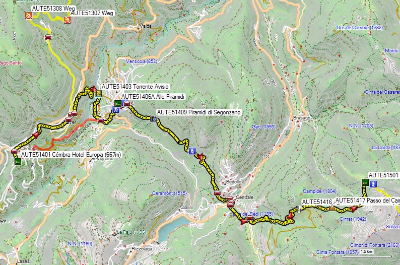 Op het einde ga je langs de rechter kant van de vallei omhoog om dan uit te komen op de centrale we door het lagere deel van de vallei. Op een bepaald ogenblik verander je van oever. Op deze oever ga je verder tot aan de hoofdweg. Je vind hier een bord met een tekening van het traject van de E5, vanaf de Bodensee. Spijtig genoeg is het bord besmeurd met graffiti.