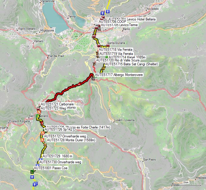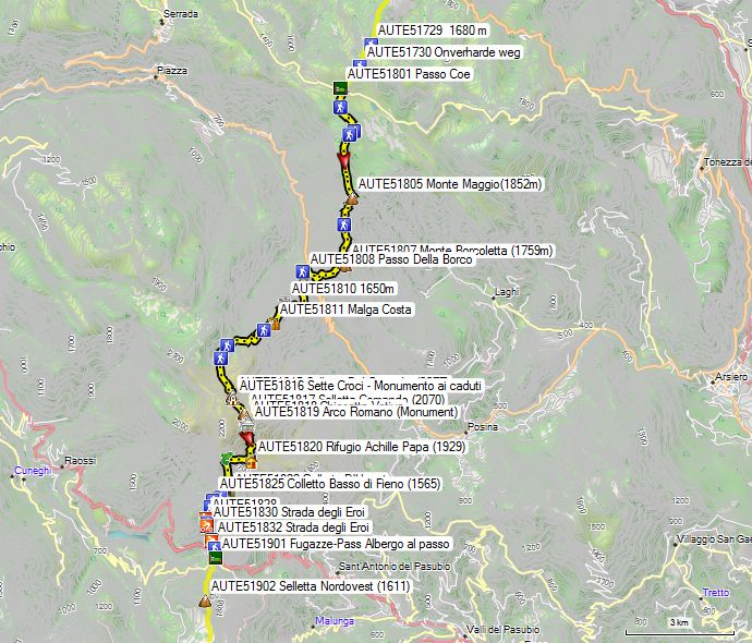 Op het asfalt ga je naar rechts tot aan een wegwijzer, waar, alwaar je via een pad links van de weg, diagonaal aanstijgt in de flank van de valleiwand. Later gaat het pad meer zigzag verticaal omhoog. Eenmaal boven krijgt het pad en grillig verloop tussen oude militaire structuren tot aan een splitsing op de Malga Costa (1u30’).