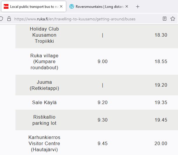 Destijds nam ik de bus vanuit Ruka, om het beginpunt van de tocht te bereiken. Van daaruit liep ik terug naar het eindpunt Ruka. Afhankelijk van jouw reisdag, rijdt de bus op een ander ogenblik van de dag. Het zal een Finse logica hebben, waar je best rekening mee houdt, bij de keuze van jouw startpunt