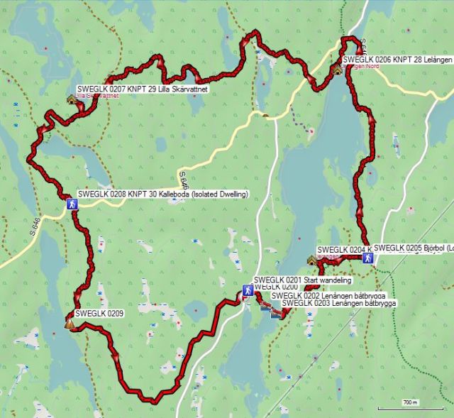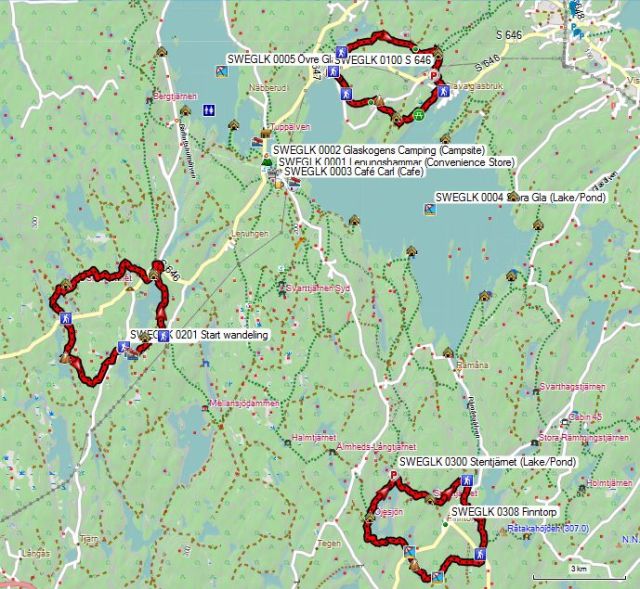 Lenungshammar en Glava Glasbruk. Je loopt via de punten 15, 16 en 17 terug naar 18. Totale afstand volgens de kaart: 13,3 km. Dit lijkt niet veel, maar als je nog een beetje van je wandeling wilt genieten, haal je, met wat rustpauzes inbegrepen, in praktijk niet meer dan 3 km/h.