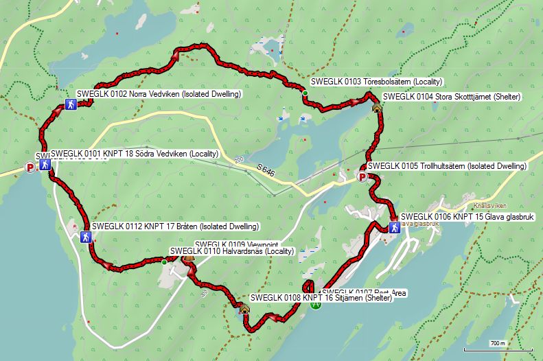 Lenungshammar en Glava Glasbruk. Je loopt via de punten 15, 16 en 17 terug naar 18. Totale afstand volgens de kaart: 13,3 km. Dit lijkt niet veel, maar als je nog een beetje van je wandeling wilt genieten, haal je, met wat rustpauzes inbegrepen, in praktijk niet meer dan 3 km/h.