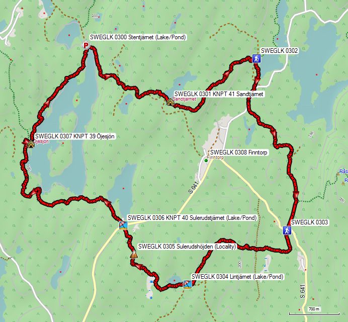 Je loopt via de punten 41, 40 en 39 rond Finntorp terug naar je vertrekpunt. Het enige probleem dat ik op de route ondervond was de grote drassigheid van het stuk vlak voor Sulerudshojden. Een paar planken zouden daar echt niet misstaan.