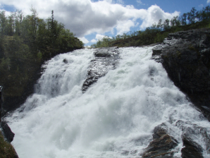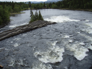 Vlak voorbij een winkel met plaatselijk handwerk (GPS 100), vind je naar links een weg naar de Handolforsen. Bij GPS 101 vind je de hangbrug over de stroomversnellingen. Je kan dan naar rechts afdalen langs de stroomversnellingen. Een kleine picknickplaats nodigt uit tot een pauze met zicht op de benedenloop van de stroomversnellingen. Vanaf hier gaat het pad weg van de oever. Op een bepaald moment eindigt het bos en kom je op een stuk zompig grasland. Hier ga je naar links en vervolgens naar rechts omhoog tot aan een soort monument.
