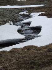 Wie richting Hellags uit wil, kiest beter voor het pad via Herrklurrtoen (richting GPS 035). Je moet een aantal meters stijgen, maar het loopt duidelijk comfortabeler dan de variante via de afslag naar Ekorrdorren. Omdat ik aanvankelijk van plan was om de route naar Ekorrdorren te lopen, liep ik die richting uit. Je loopt door een steenvlakte naast de rivier en dat loopt weinig aangenaam. Eenmaal aan de afslag (GPS 034) (45’), werd mijn bang vermoeden dat er te veel sneeuw lag om de pas richting Ekorrdorren veilig te kunnen dwarsen bevestigd. En dus veranderde ik mijn plannen en liep ik braaf richting Hellags. Tot aan GPS 035 (30’) is het nog een hele natte en stenige bedoening, maar eenmaal terug op het hoofdpad is het aangenaam lopen.