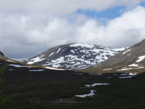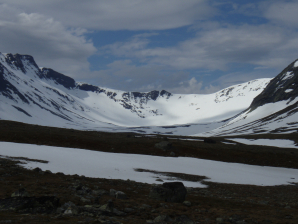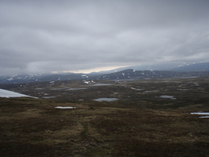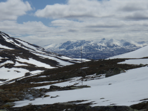 Vanaf hier vond ik in toenemende mate sneeuw. Na 1 uur bereik je het hoogste punt (GPS 011). Vanaf hier kijk je door de vallei van de Norder-Tvaran neer op de Handolan vallei met de toegangsweg tot Storulvan.