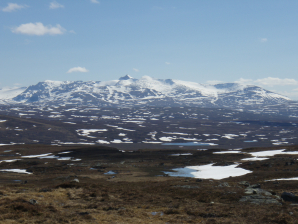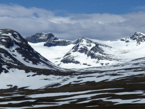 Bij GPS 115 vind je een waadplaats. Bij GPS 116 ben je zowat op het hoogste punt. Vanaf hier is het nog 2,5 km richting Blahamarrens Fjällstation (GPS 117). Je loopt over een hoogvlakte gelardeerd met meertjes en riviertjes. De hoofdkleur is grijs vanwege de stenen met vlakken wit vanwege de sneeuw. Reken hier niet op veel kampeerplaatsen. Je moet hiervoor afdalen tot Graslidfjallet Vindskydd of de brug over de Enan (GPS 118). Vanaf de brug loop je via een zand-grindweg tot aan de parking van Rundhogen (GPS 122) (8km – ca.2u). Laat je niet afleiden van de weg door de verftekens die je een pad opsturen. Dat is nodeloze omweg. Het heeft waarschijnlijk te maken met het feit dat je een beetje over een erf van een soort boerderij loopt. De Zweden trekken er zich ook niets van aan.