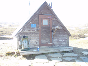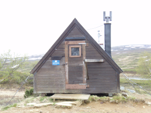 Ikzelf ben de rivier stroomopwaarts van het einde van het pad gedwarst. Nadat ik met droge voeten de overkant bereikte, loop ik naar de schuilhut (GPS 064) (4u vanaf Helags). Toen ik de deur van de schuilhut opende sloeg mij een stoomwolk in het gezicht.