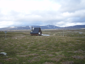 Gelukkig heb je nog het winterpad om de grote richting aan te geven. Door sneeuw en drassig gebied bereik je eerst de splitsing met het pad naar Blahammarens Fjallstation (GPS 016). Een paar honderd meter verder vind je de Ulvatjarn schuilhut (2,5u) (Droogtoilet en vuilbak). Gelukkig scheen het zonnetje hier en vond eindelijk de tijd om wat te zitten en wat calorieën in te slaan.