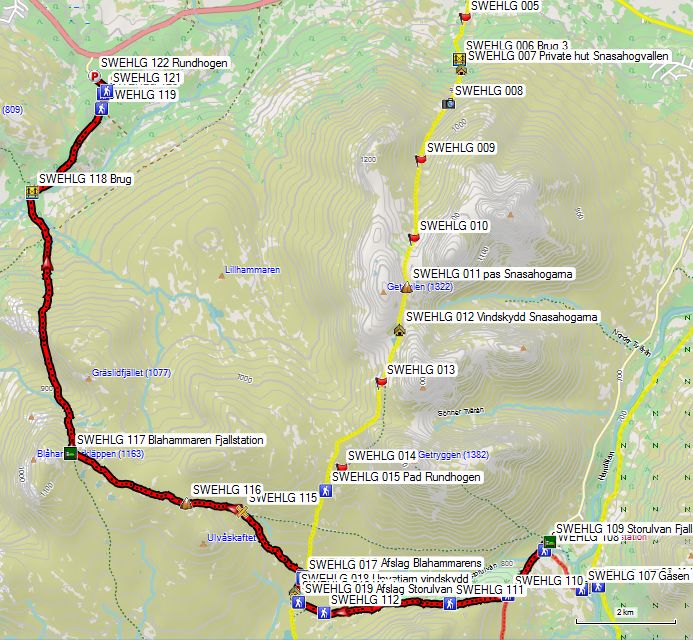 Bij punten GPS 016 en 017 vind je de splitsing met het pad naar Rundhogen en Snasahogarna.
