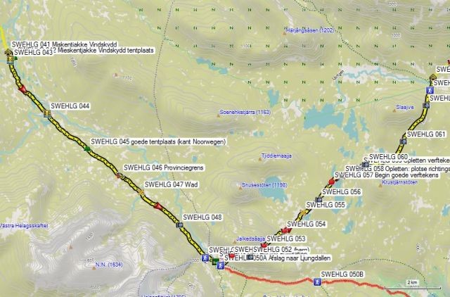 Vanaf de splitsing van de variant via Herrklurrtoen (GPS 035) is het pad goed gemarkeerd. 1km voor de Mieskentjakke Vindskydd moet je waden, en daar kom je niet toe met klassieke bergschoenen.