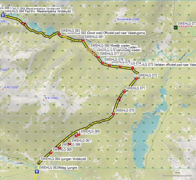Tot aan GPS 084 is het niet moeilijk om het pad te volgen. De schuilhut (GPS 084 Mieskentjakke Vindskydd) lig op de winterroute tussen 2 meren en dus dien je van GPS 084 (Pad thv. Mieskentjakke Vindskydd) af te dalen richting hut indien daar een pauze wil houden.