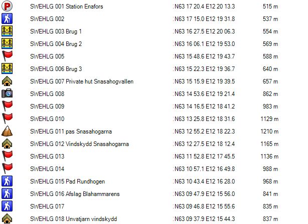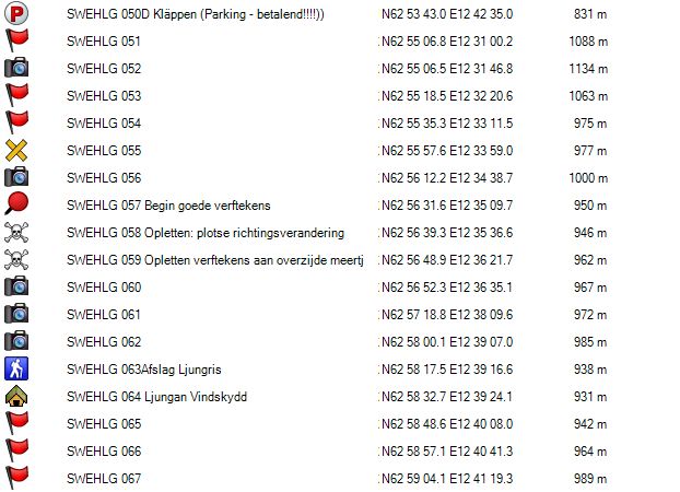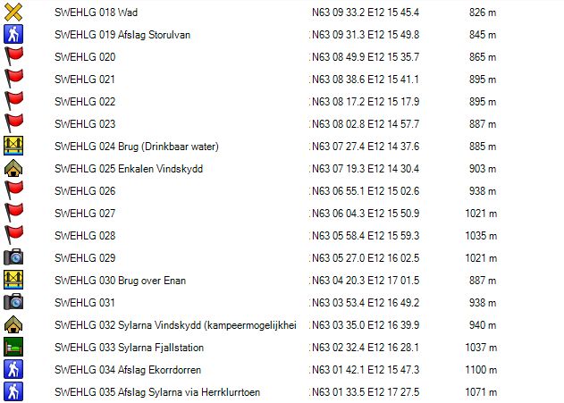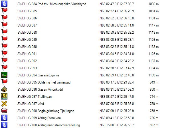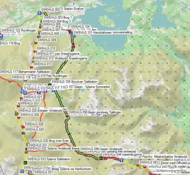 Je verlaat het fjallstation (GPS 109) via de brug over de rivier Storulvan . Je gaat aan de splitsing (GPS 108) naar rechts en dan gaat het recht omhoog langs de elektriciteitsleiding tot je boven de bomenlijn komt. Daar vind je een paar picknicktafels (GPS 110) en wegwijzers. Hier ga je naar rechts. Vanaf hier stijgt het pad maar langzaam. Door het feit dat er hier nog wat bomen staan en de zijdelingse helling soms wat steil is, ligt er hier nog redelijk wat sneeuw, maar er wordt op dit deel voldoende gelopen, waardoor dit geen probleem is. Bij GPS 111 komt de winterroute terug bij de zomerroute. Vanaf hier wordt het terrein meer open. Bij GPS 112 is er een splitsing van de winterroute richting Enkalen en Sylarna. Bij GPS 019 is er opnieuw een splitsing voor zowel zomer- als winterpad richting, Enkalen en Sylarna. Bij GPS 019 Wad vind je geen brug zoals vermeld op de stafkaart maar een wad met stapstenen in de vorm van betonbalken. Met mijn schoenen met een schachthoogte van 20 cm geraakte ik met droge voeten aan de overzijde, maar iemand met normale bergschoenen heeft hier in het begin van de zomer en bij slecht weer pech.