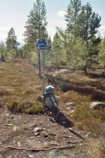 Vanaf dit laatste punt is het pad minder drassig. Vervolgens loop je langs Bustvälen en vervolgens vind je plots ‘in the middle of nowhere’ de splitsing (GPS 0305) naar Reva en Skedbrostugan . Wie geen tent bijheeft zal de 4km naar Skedbro moeten lopen om zeker te zijn van een overnachtingspunt. In Skedbro (GPS 0305A) vind je 20 bedden, proviand, noodtelefoon en visvergunningen. Tarieven voor Jeugdherbergleden: 185 SEK of 235 SEK (17/7 tot einde seizoen). Gezien ik wel mijn tent meesleur, ga ik rechtstreeks naar Reva (2km). Het is een vrij idyllisch plekje, gelegen vlak bij de grens Zweden-Noorwegen en het is vooral geliefd bij vissers. De gesloten windhut (GPS 0306) met ruim plaats voor 4 personen leek langdurig in beslag genomen door een sportvisser. (De hut is daar niet voor bedoeld, maar ze wordt er duidelijk wel voor gebruikt.)