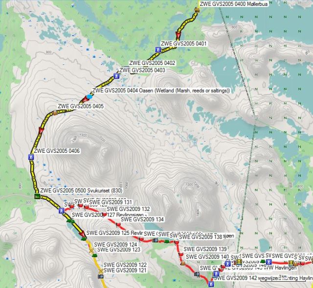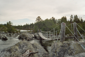 Je enige oriëntatie hier zijn de tekens en de berg Stor-Svuku. Daar waar de eerste brug (GPS 402), aangeduid op de kaart een echte brug op staalkabels is, is de tweede reeks bruggetjes vlak van matige kwaliteit en dan vooral de leuningen of wat daar voor moet doorgaan. Het komt erop neer dat je zelf je evenwicht moet bewaren op een paar glibberige boomstammen. Voor deze laatste bruggetjes vind je zowaar de enige houten planken door een moerassig stuk.