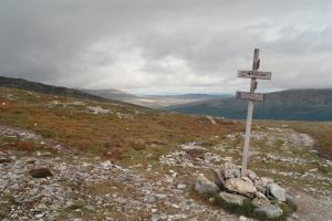 De rest van het pad loopt van cairne naar cairne over een kale droge hoogvlakte. En uiteindelijk kom je dan aan de Altarringen, een bevreemdend monument in the middle of nowhere. Het beeld wordt wel een beetje ontsierd door een kist, waar waarschijnlijk een hedendaags religieus symbool in zit. Het wordt duidelijk nog gebruikt, vermoedelijk door Sami (Lappen). Terug langs dezelfde weg.